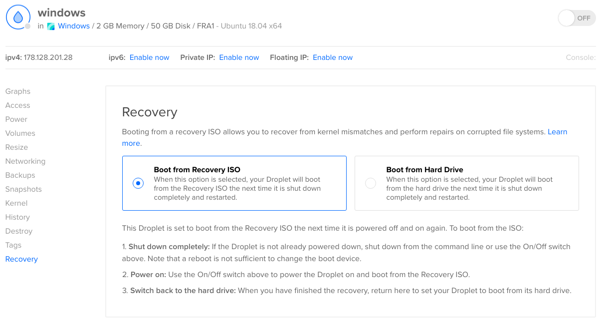 First click Recovery on the bottom left, then select Boot from Recovery ISO and turn off the droplet using the switch in the top right.