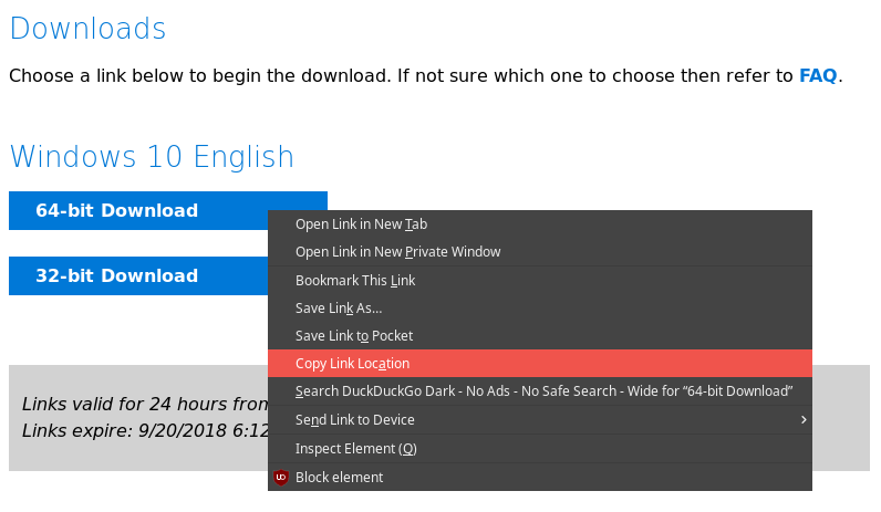 Select Windows 10 and English, then right click on 64-bit Download and select copy link location.