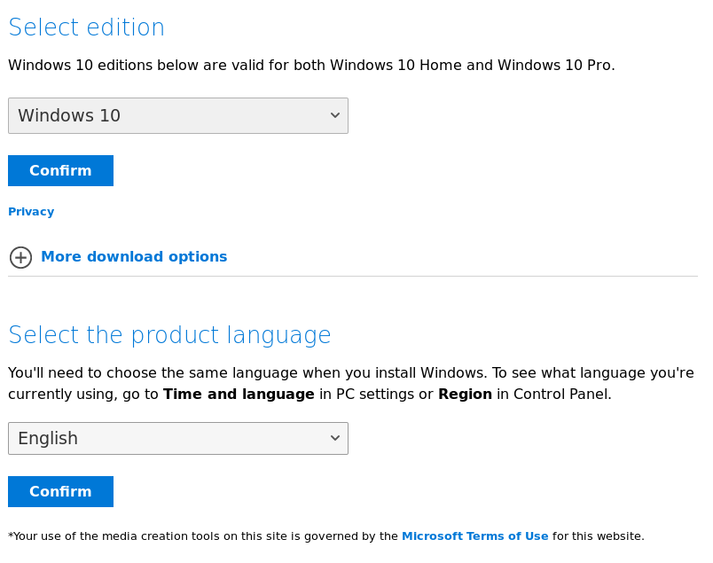We will also need a copy of the Windows 10 ISO. To get this you will need to visit Microsoft’s ISO download page to generate a unique link.