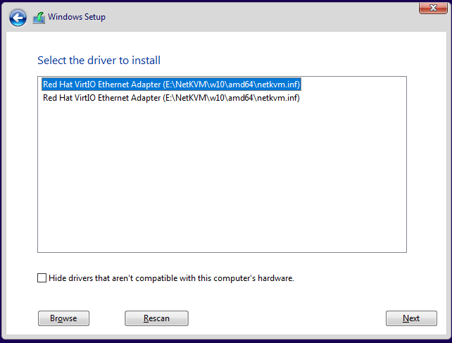 Now we can select the Network driver, which can be found in E:\NetKvm\w10\amd64.