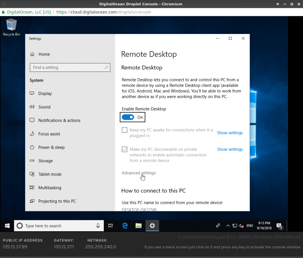 From here we toggle the Enable Remote Desktop button, then click Advanced settings